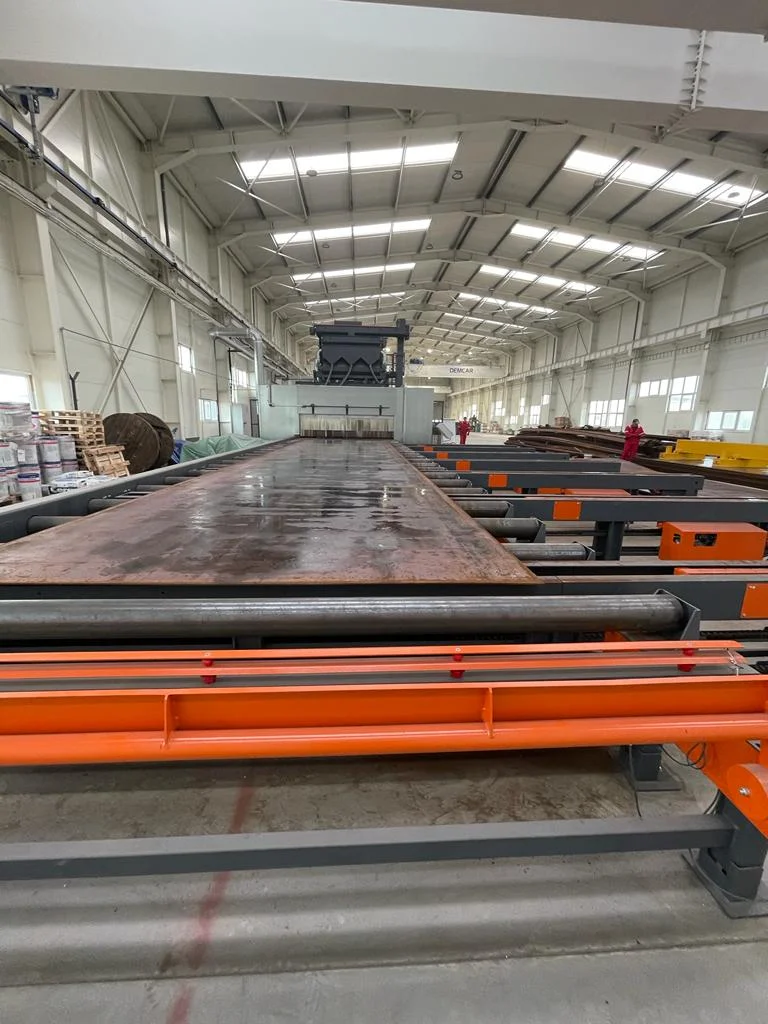 - Sablare automată — masa de role este acționată de 8 turbine (22 kW fiecare), reglabile cu variatoare de frecvență, asigurând o sablare conform standardului SA 21/5 (DIN‑EN‑ISO 8501‑1).